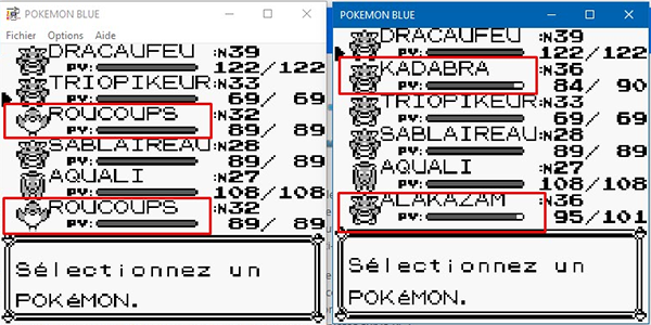 L'idée est donc de refaire un échange entre les deux, sur le GB1, je prend un des deux Roucoups qu'il y a, et sur le GB2, je prend Alakazam pour le remettre sur le GB1. La procédure est exactement identique à celle que nous venons de faire, alors une fois l'échange terminé et le jeux redémarré, si vous allez voir les Pokémon sur le GB1, vous pourrez constater qu'il y a de nouveau un seul Roucoups et un Alakazam, et accessoirement, plus de Kadabra.
